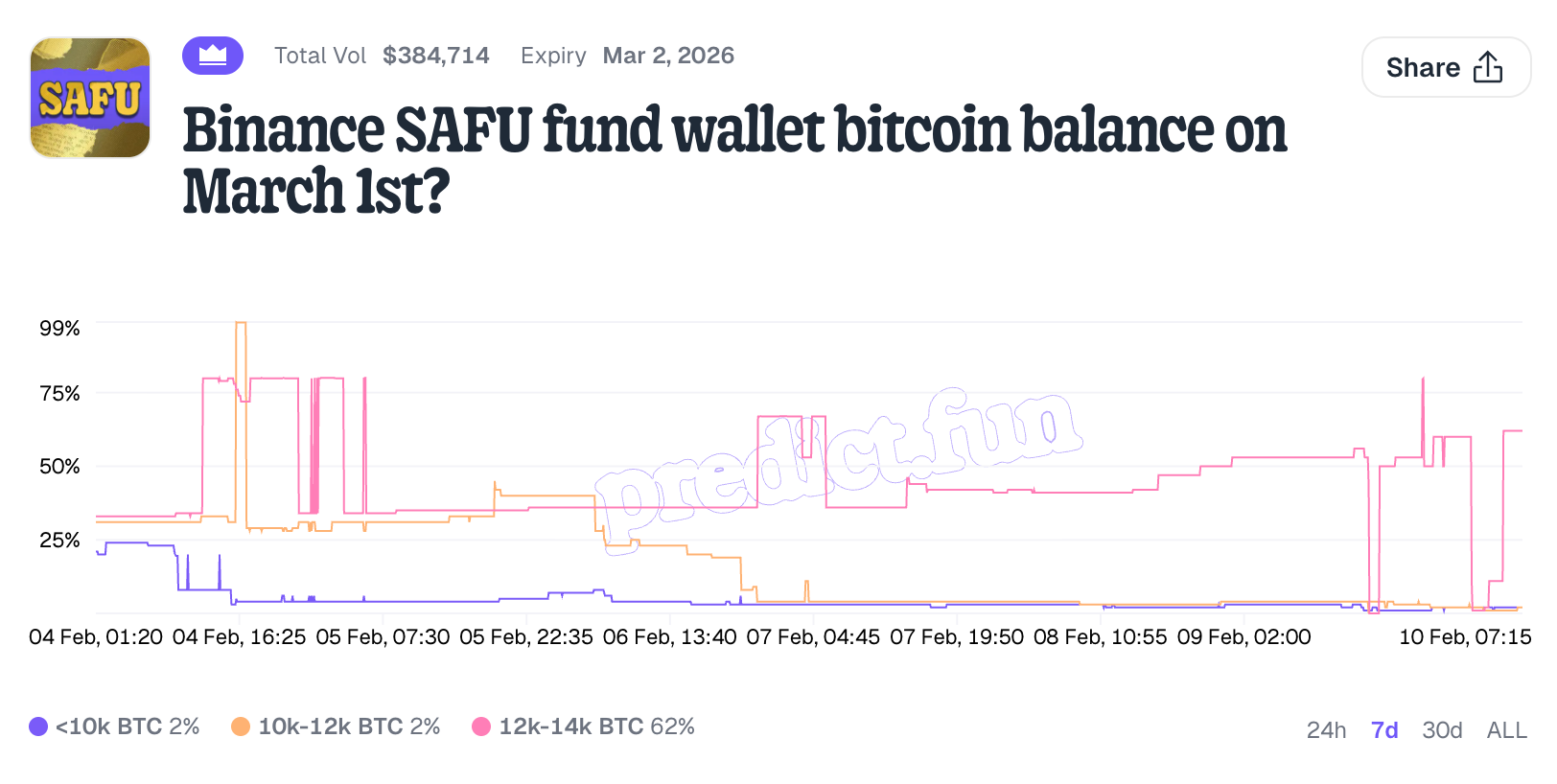 Selain mekanisme produk dan pengalaman interaksi, beberapa platform pasar prediksi baru juga mulai mencoba rute diferensiasi dalam desain konten pasar, yaitu tidak hanya menyalin peristiwa umum yang sudah ada di Polymarket atau Kalshi, tetapi meluncurkan "pasar peristiwa eksklusif" dengan atribut lapisan yang lebih jelas yang berputar di sekitar topik dengan perhatian tinggi di dalam komunitas kripto. Misalnya, peristiwa prediksi terkait yang diluncurkan di predict.fun seputar Binance dan hotspot komunitas, termasuk "Perubahan saldo Bitcoin dompet dana SAFU Binance pada 1 Maret", "Jumlah tweet CZ antara 7 dan 14 Februari 2026", dll., semuanya termasuk jenis topik yang lebih dekat dengan diskusi harian pengguna kripto.