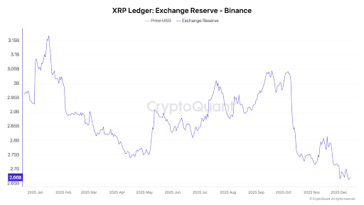 Data on-chain menunjukkan XRP meninggalkan Binance dengan cepat, mendorong cadangan bursa turun menjadi sekitar 2,66 miliar XRP, level terendah yang tercatat tahun ini. Pergerakan ini telah menarik minat peserta pasar karena tidak mencerminkan aksi harga XRP saat ini. Wawasan dari komentator pasar Stellar Rippler di X membantu menjelaskan mengapa investor harus memperhatikan arus bersih.