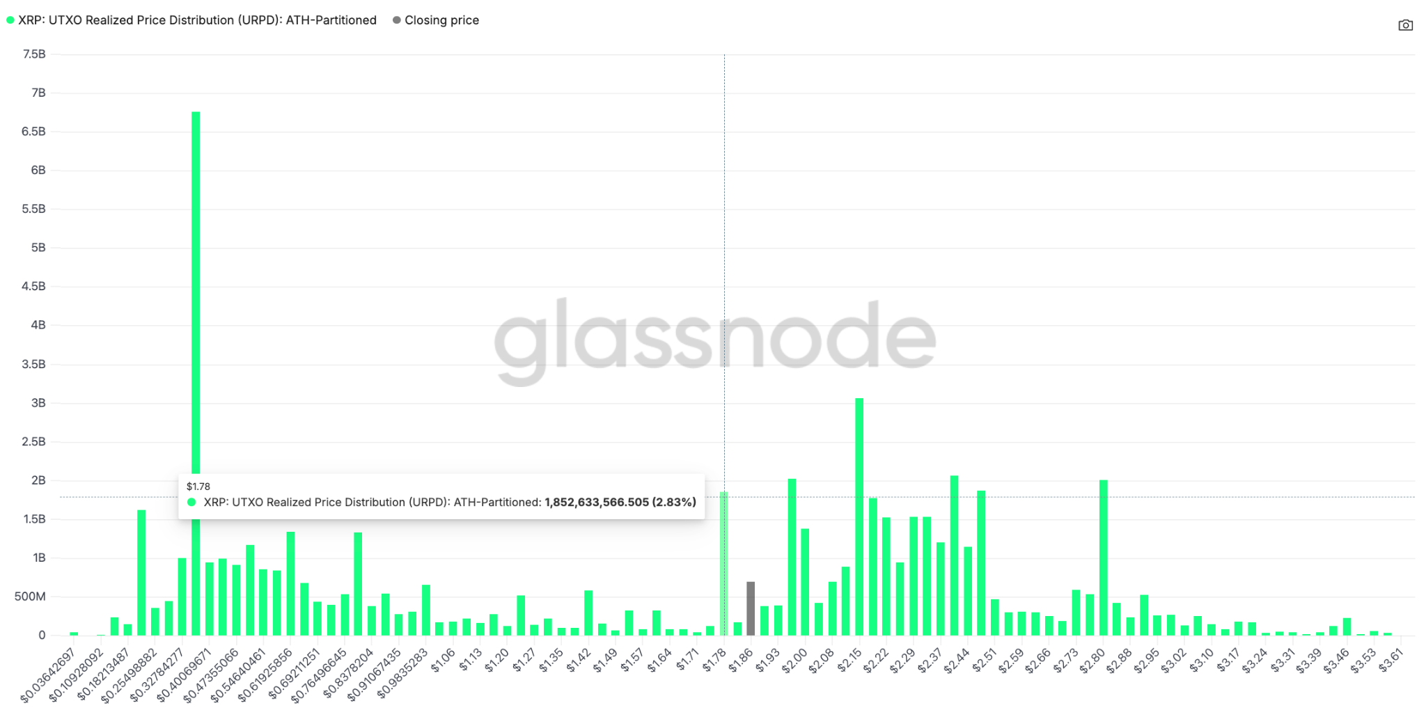 UTXO realized price distribution (URPD) Glassnode — sebuah metrik yang menunjukkan harga rata-rata di mana pemegang SOL membeli koin mereka — mengungkapkan bahwa support signifikan berikutnya berada di $1,78, di mana sekitar 1,85 miliar XRP sebelumnya diperoleh.