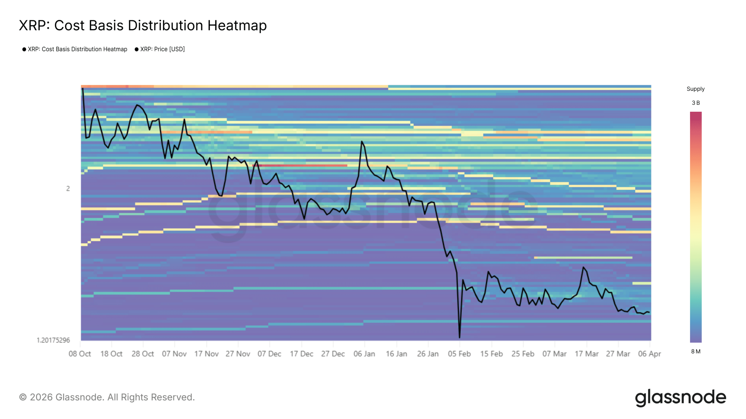 Ketika harga XRP turun dari di atas $2,5 ke kisaran $1,2–$1,3, kluster pasokan besar tetap terkonsentrasi antara $1,9 dan $2,2.