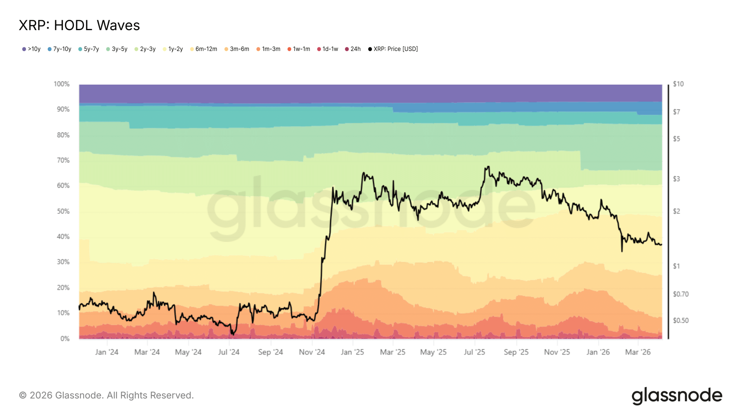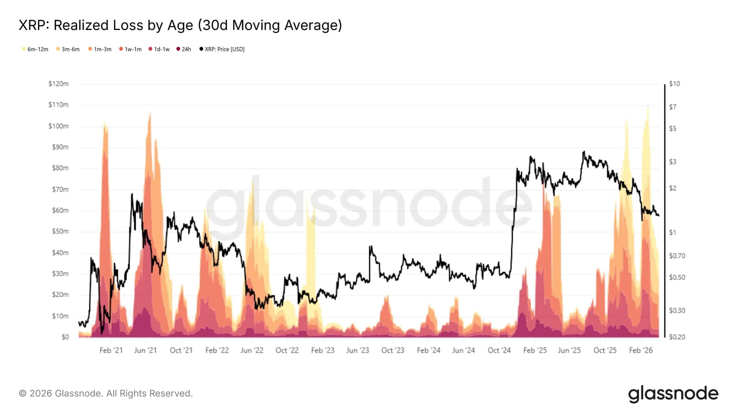 Kerugian ini terkumpul dalam kohort yang lebih baru, menunjukkan keluar paksa daripada rotasi strategis. Sementara itu, XRP tetap di bawah level realisasi $1,43, menjaga sekitar 56% pasokannya di bawah air.