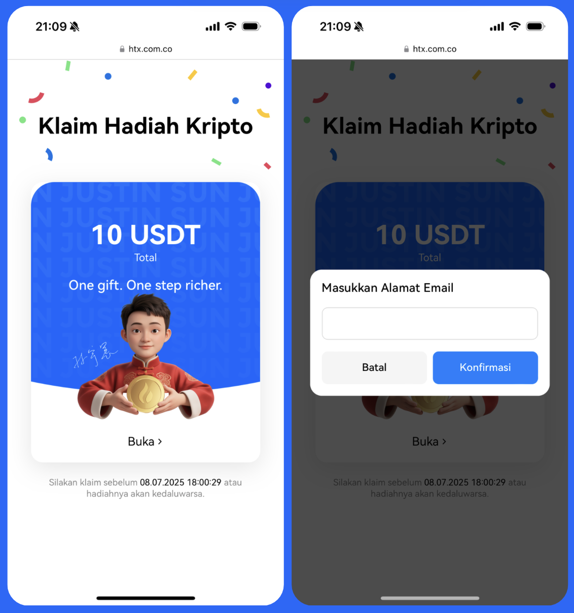 - Pengguna HTX yang belum terdaftar harus mendaftar akun HTX dalam waktu 48 jam setelah mengklaim Hadiah Kripto agar dapat mengaktifkan hadiah mereka. Dengan demikian akan terjalin hubungan referral dengan pengirim hadiah.