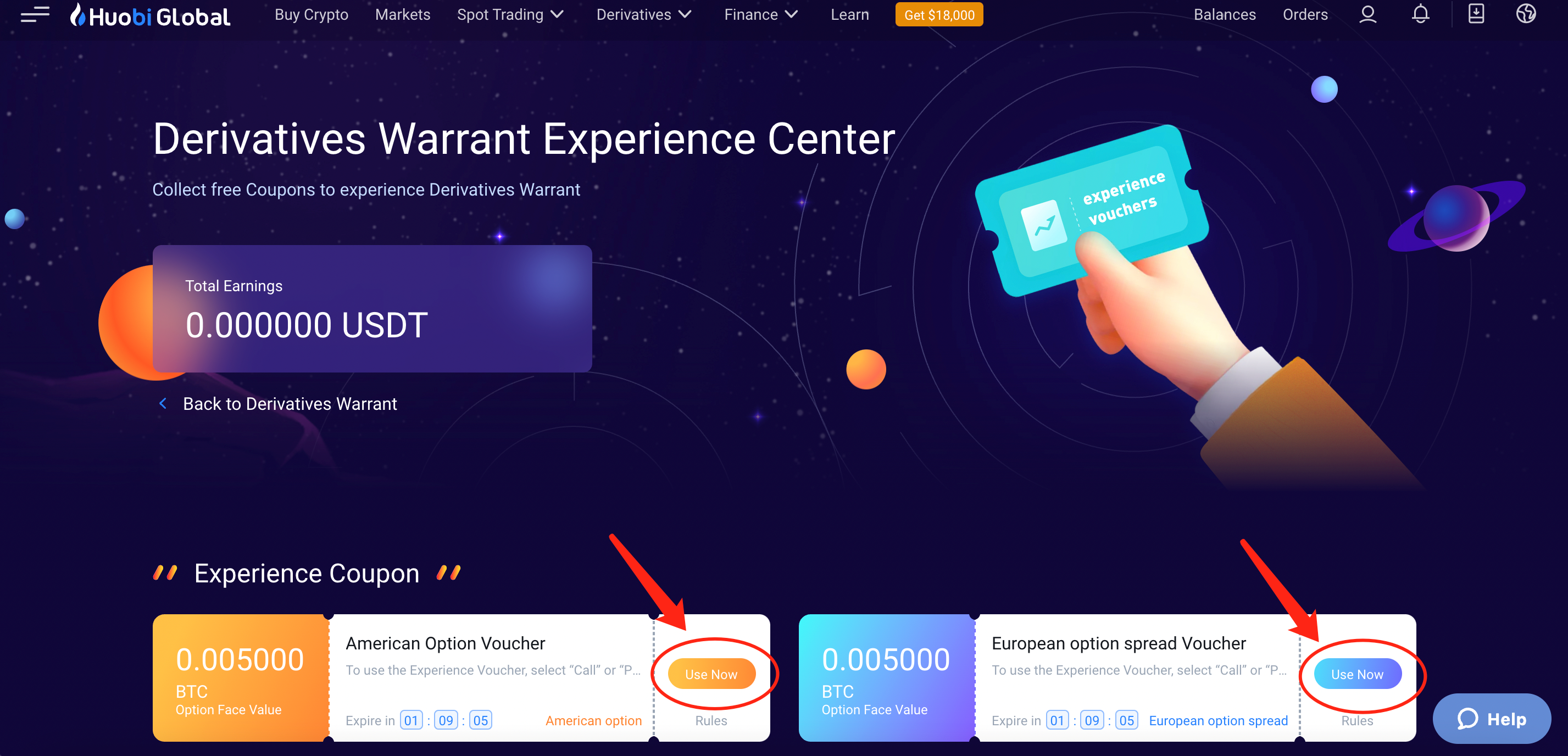 1/ Buka beranda HTX Options:https://www.huobi.com/en-us/otc-option/exchange/#btc_usdt, dan klik di “Experience Center”, atau kunjungi langsung tautan ini:https://www.huobi.com/en-us/otc-option/exp/center