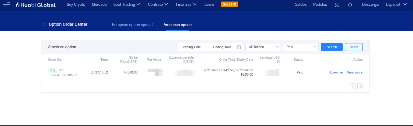 Di bagian bawah antarmuka perdagangan opsi, pengguna dapat melihat kontrak terbuka. Informasi yang ditampilkan berisi waktu yang tersisa, keuntungan/kerugian yang belum direalisasi, dll. Selain itu, pengguna dapat memilih untuk melaksanakan opsi lebih dahulu di halaman ini. Waktu yang tersisa merupakan waktu yang tersisa sebelum kontrak berakhir.