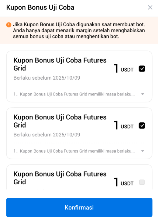 - Bonus Uji Coba Futures Grid tidak dapat digunakan untuk membuka posisi dalam futures trading standar atau copy trading.