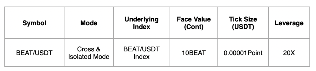 HTX has launched BEAT/USDT perpetual futures, which supports 1-20x leverages for long and short trades.