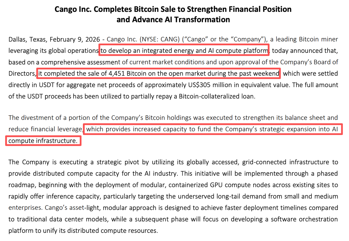 又有一家美股上市的比特币挖矿公司缴械投降转到AI了,随着Cango股价在1年内跌了85%,昨天宣布清仓了超过一半持有的BTC总共4451个,公司在全球40多个矿场也会逐步转向AI算力平台,一边是比特币价格持续低迷挖矿难度提高,另一边是AI热钱高涨蹭一下就能拉盘😥
