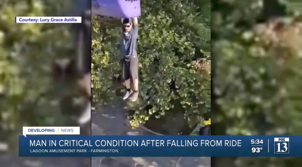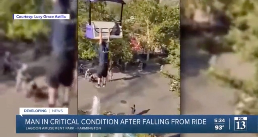 Visitors at the Lagoon Amusement Park in Farmington spotted the unidentified man clinging to the safety bar of the Sky Ride chair on Saturday as it moved over a water fountain before he plummeted about 50 feet to his death.