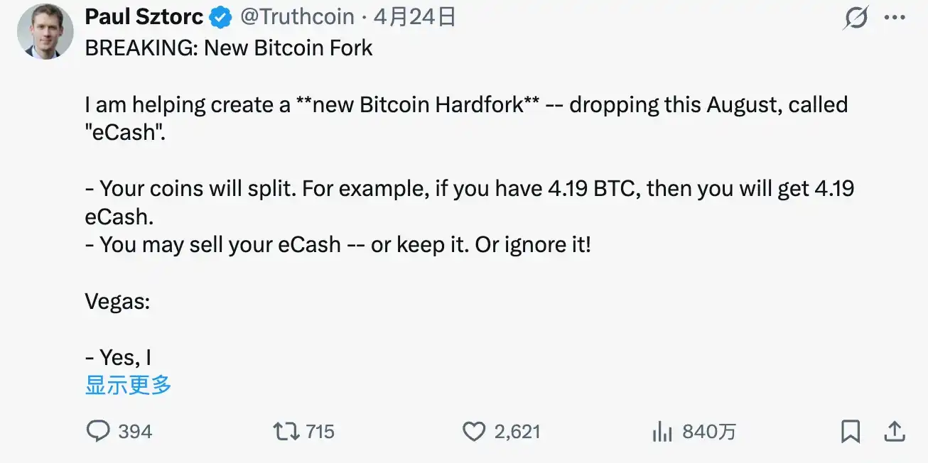 4月28日,Paul Sztorc宣布正在推动一个名为eCash的比特币硬分叉项目,预计于2026年8月21日在比特币区块高度约964,000时正式启动。