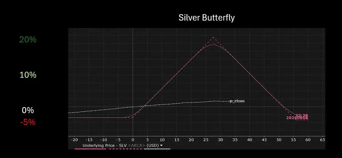 - Allocate 5% capital to a SLV (iShares Silver Trust ETF) 70-90-110 June butterfly, costing about $2.50.