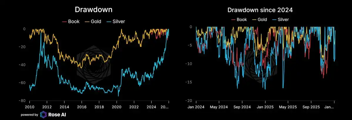 Instead of focusing on the return rate, let's look at the actual composition of the portfolio. You can see that our portfolio's correlation with silver has increased, and our volatility target remains around 30.
