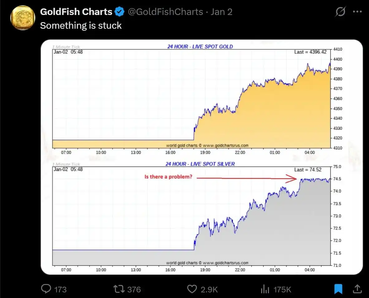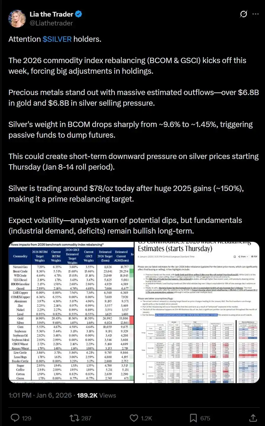 The shorts are waging war. A noteworthy observation is that index rebalancing is imminent—silver's weight in some commodity baskets will drop from nearly 10% back to its historical average of 2%. I believe the final outcome will be a structural increase in silver's weight, but the shorts are also correct: this will indeed bring selling pressure in Western markets.