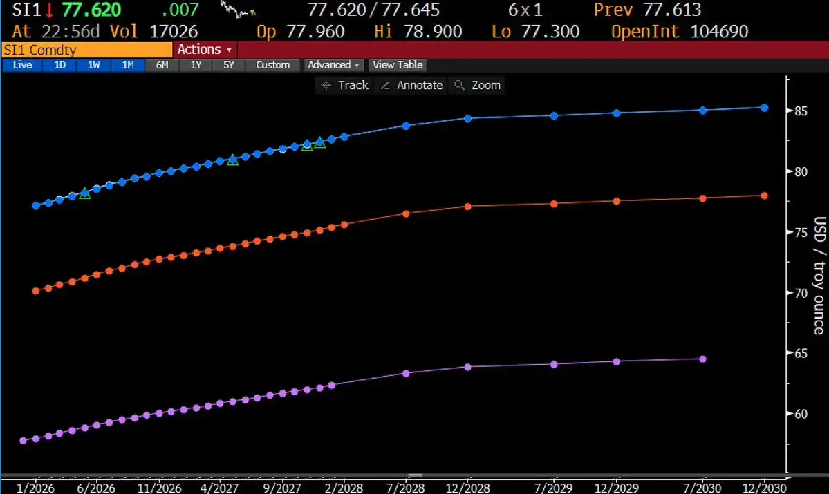 New York (COMEX) market: The current price is $76.93, market inventory is relatively ample, and the futures curve shows a typical Contango shape—near-term prices are lower than forward prices because holders need a premium to cover carrying costs.