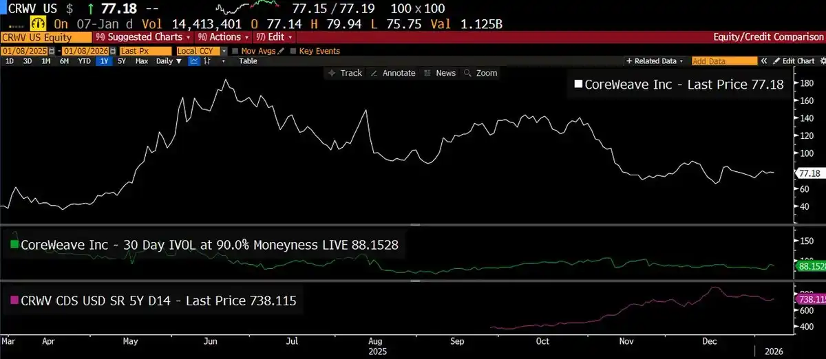 Credit spreads are as high as 700+ basis points, while stock volatility is only 80. If analyzing Coreweave's credit spread (700bp) and leverage level using the Merton model, what should the actual volatility of 5-year debt be? This might provide a new market perspective.