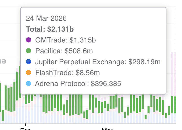 The spike in perps volume is essentially a return of leveraged traders positioning around Solana. With over 60% of the total volume coming from a single venue (GM Trade), the move is mostly institutional-scale.