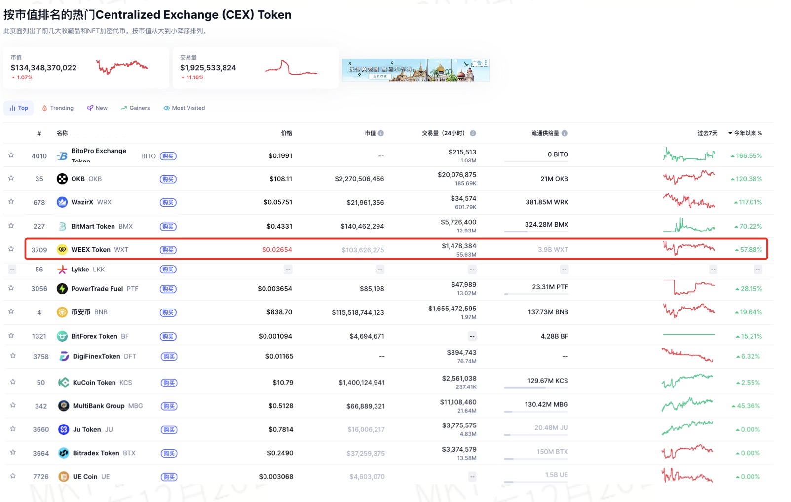 According to CMC data, as of December 24, WXT's price increase in 2025 was 57.88%, ranking 5th among the 53 CEX platform tokens with comparable data tracked by CMC. This performance not only surpasses 90% of platform tokens like BNB but also demonstrates strong resilience in a market environment where BTC fell by 6.75% during the same period.