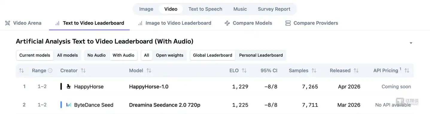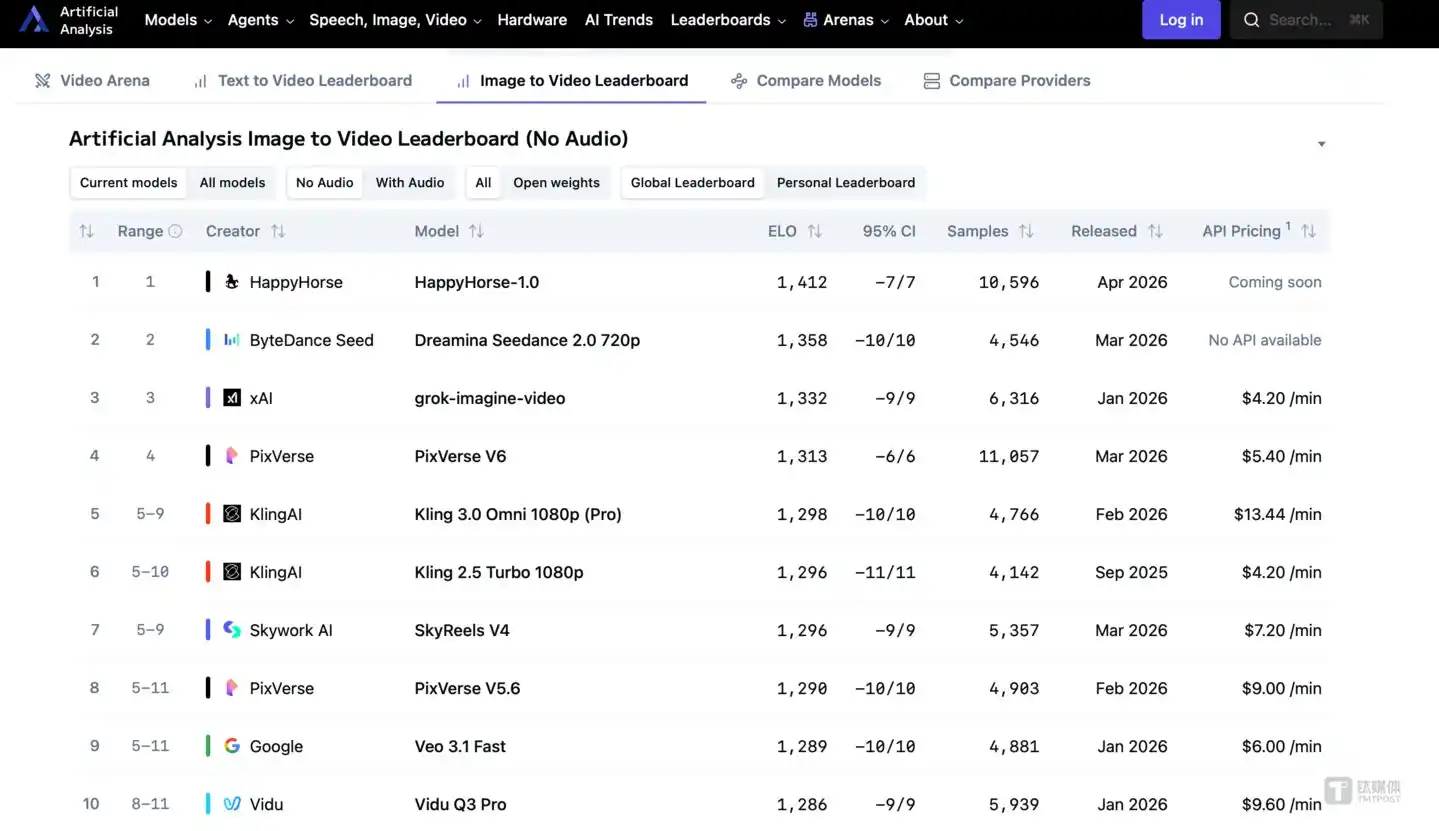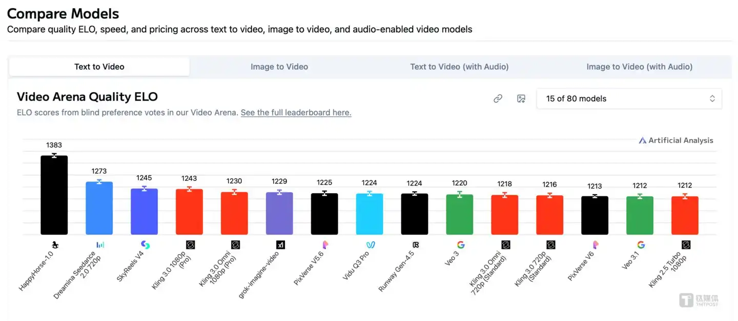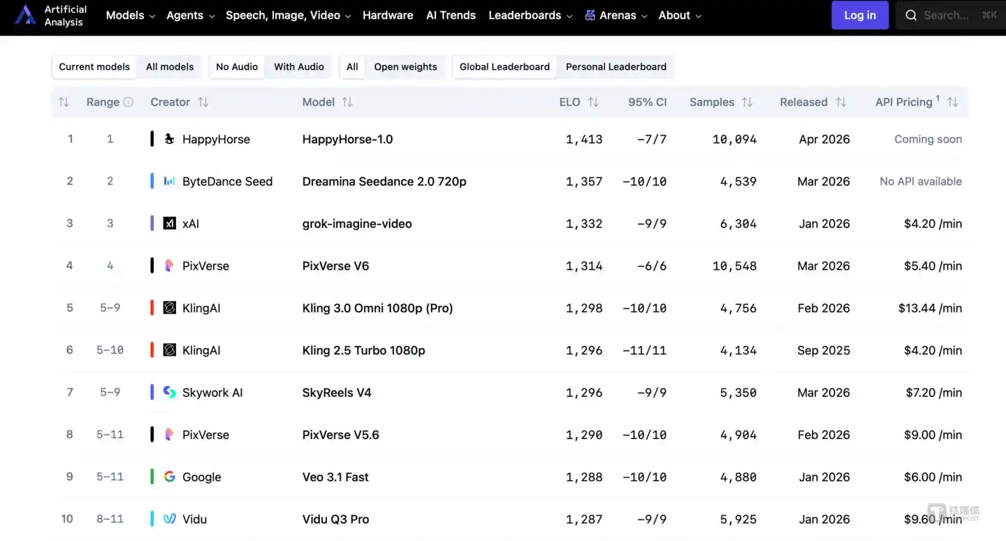 The second: Less than two weeks later, on April 7th, an anonymous model codenamed "HappyHorse-1.0" unexpectedly topped the most authoritative AI video blind test leaderboard, Artificial Analysis, with an overwhelming score.