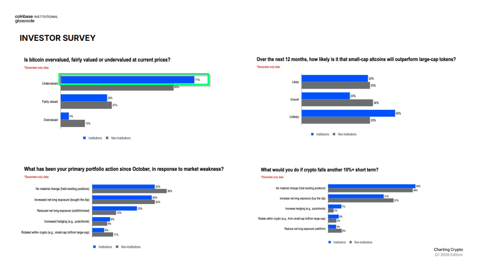 Reports say about 71% of institutional investors view Bitcoin as undervalued when it sits between $85,000 and $95,000. Independent investors are not far behind, with 60% sharing that view.