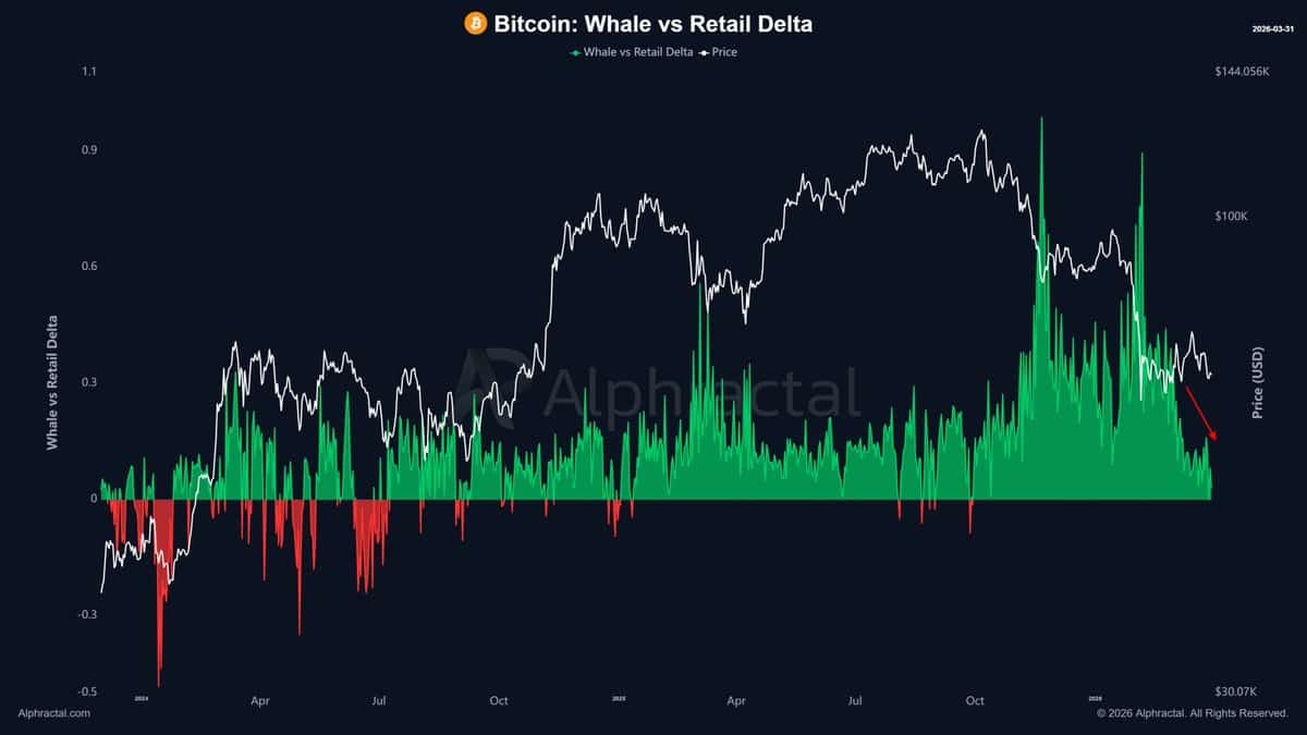 The whale-versus-retail delta—an indicator used to track positioning between large holders and smaller investors—points to a widening divergence. Recent data shows whales increasing their short exposure, while retail traders continue to build long positions.