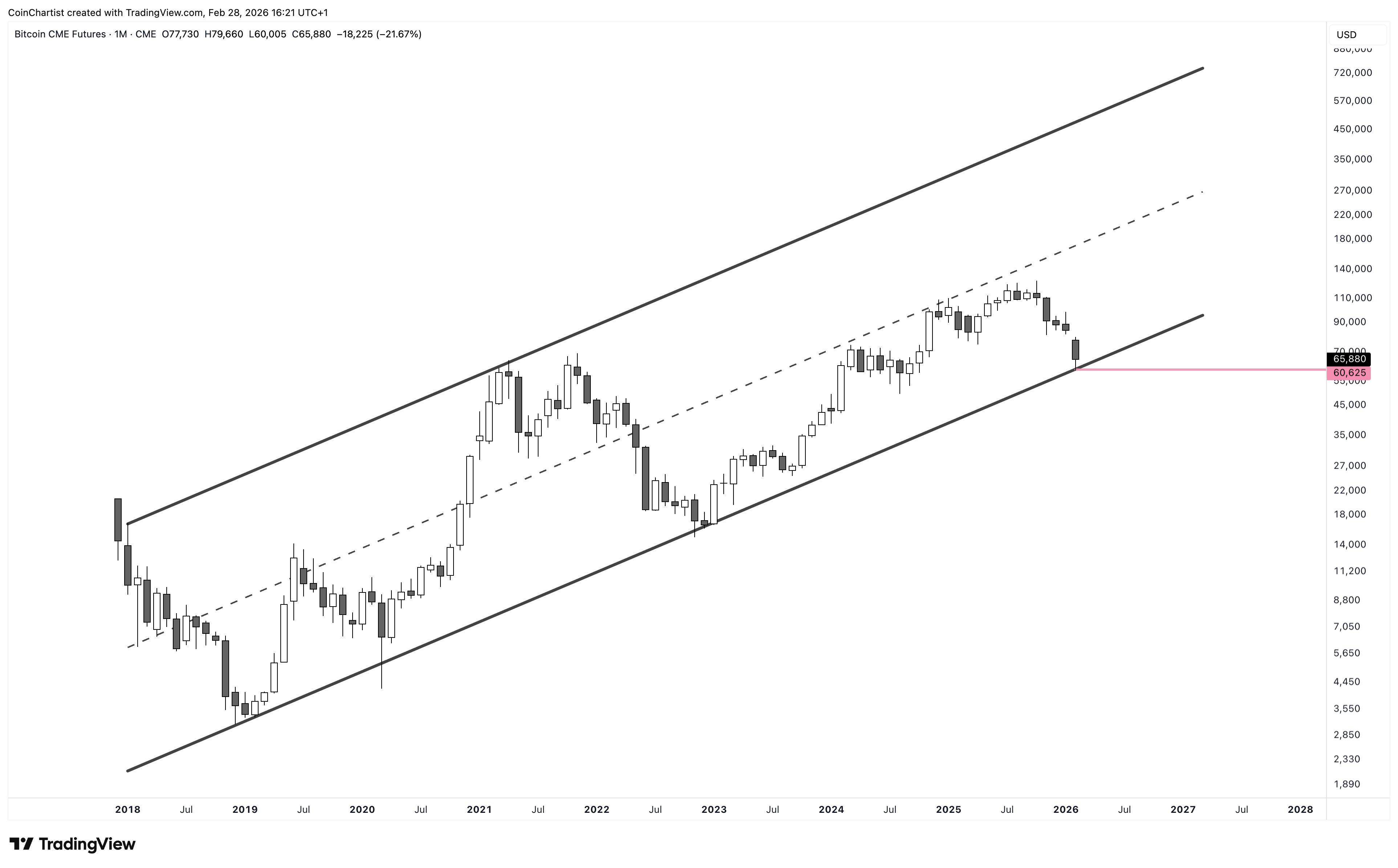 Unsurprisingly, the premier cryptocurrency rebounded from the support cushion around $63,000, recovering from the early-weekend slump triggered by the ongoing clash between the United States, Israel, and Iran. Typically, the next target after this bounce-back is the channel’s midline, which could be as high as $475,000.