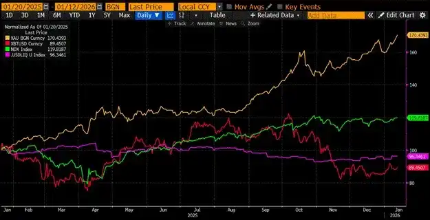 First, let's compare the returns of Bitcoin, gold, and the Nasdaq index during the first year of Trump's second term (2025), and the relationship between these asset performances and changes in US dollar liquidity.