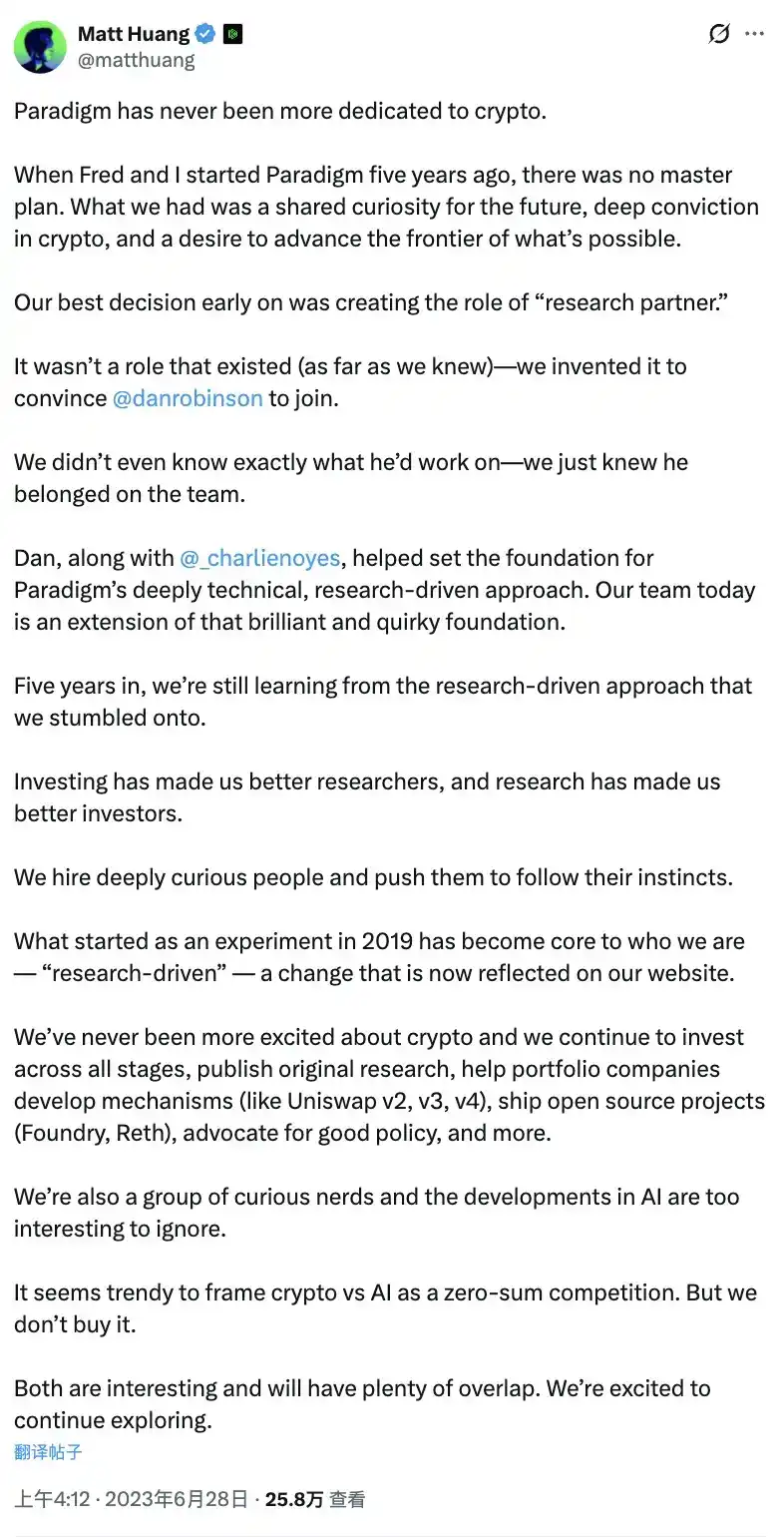 Co-founder Matt Huang had to put out the fire. He tweeted that Paradigm had "never been more excited about crypto," while adding: "The developments in AI are too compelling to ignore. Framing AI and crypto as a zero-sum competition is a popular but mistaken narrative. We don't buy it. Both are interesting and will have significant overlap."