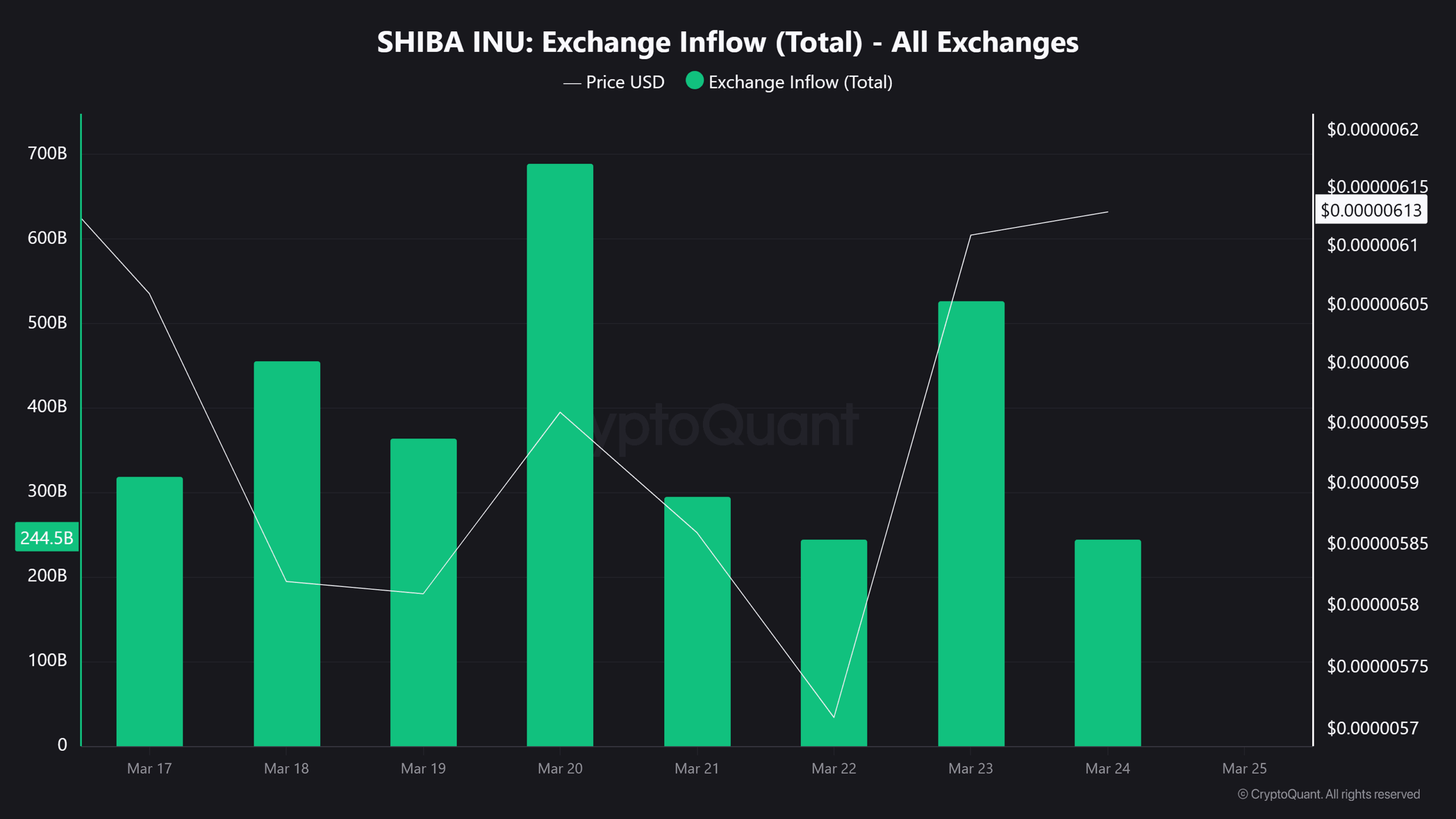 In fact, the token has recorded a total of 800 billion SHIB, which is approximately $4.8 million based on the trading price at press time. This suggests more capital is entering the exchanges from investors, probably with an intention to take more long positions during the correction.