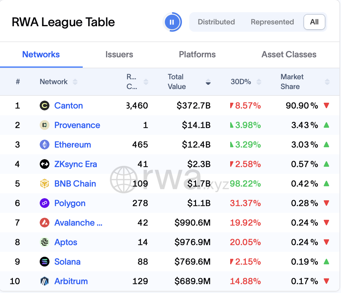 Data from RWA.xyz also shows the Canton Network now leads the market for tokenized real-world assets by a wide margin, with more than $370 billion represented onchain, far outpacing popular networks such as Ethereum, Polygon, Solana and other public chains.