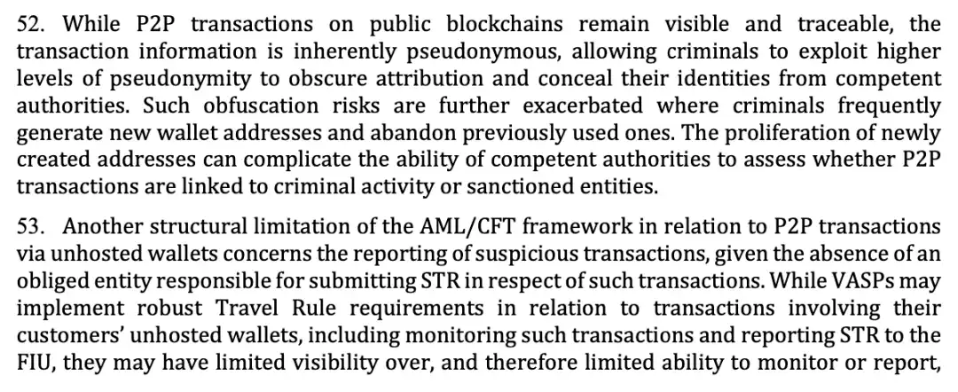 The report further emphasizes that P2P transactions between non-custodial wallets have no legal entity obligated to submit Suspicious Transaction Reports (STRs) to financial intelligence units. Although compliant VASPs fulfill the Travel Rule and monitor transactions when customers transfer funds to their non-custodial wallets, once the funds leave the VASP's sight and undergo multiple hops between non-custodial wallets, the VASP can no longer continue tracking, allowing criminals to escape the regulatory net. This may represent a structural loophole in the AML regime for virtual assets. When funds operate entirely outside licensed institutions, the traditional 'person-focused' regulatory model becomes ineffective. In the future, regulators may require VASPs to implement stricter due diligence measures for non-custodial wallet transactions, even promoting technical solutions (such as built-in whitelist/blacklist functions in smart contracts).