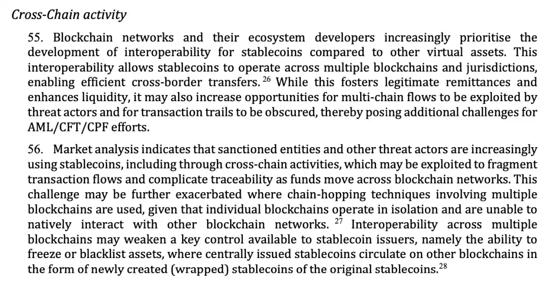 Compared to other virtual assets, blockchain networks and developers are prioritizing the development of cross-chain interoperability for stablecoins. This technology allows stablecoins to flow freely across multiple blockchains (such as Ethereum, Solana, TRON, etc.) and different jurisdictions, enabling efficient cross-border transfers. However, cross-chain transactions increase traceability difficulties, weaken the ability of stablecoin issuers to implement controls, and can lead to related stablecoin transactions moving outside the regulated system.