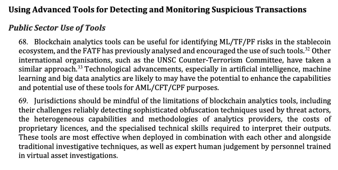 The report clearly states that blockchain analysis tools hold significant value in identifying money laundering, terrorist financing, and proliferation financing risks within the stablecoin ecosystem. FATF has previously analyzed and encouraged the use of such tools on multiple occasions, and international organizations like the UN Security Council Counter-Terrorism Committee have adopted similar positions. The report specifically mentions that technological advancements in areas such as artificial intelligence, machine learning, and big data analytics are substantially enhancing the capabilities and application potential of these tools. This means that blockchain analysis tools are no longer limited to simple address labeling and transaction tracking but can discover more隐蔽的犯罪模式 through intelligent algorithms. Against the backdrop of surging stablecoin transaction volumes and frequent cross-chain activities, manual review alone is completely incapable of covering the massive number of transactions. With the help of AI, machine learning, and blockchain analysis tools (such as Beosin KYT), institutions can achieve automated identification and预警 of suspicious behavior, analyzing and tracking over 120 complex cross-chain protocols and mixing transactions, significantly improving regulatory efficiency.