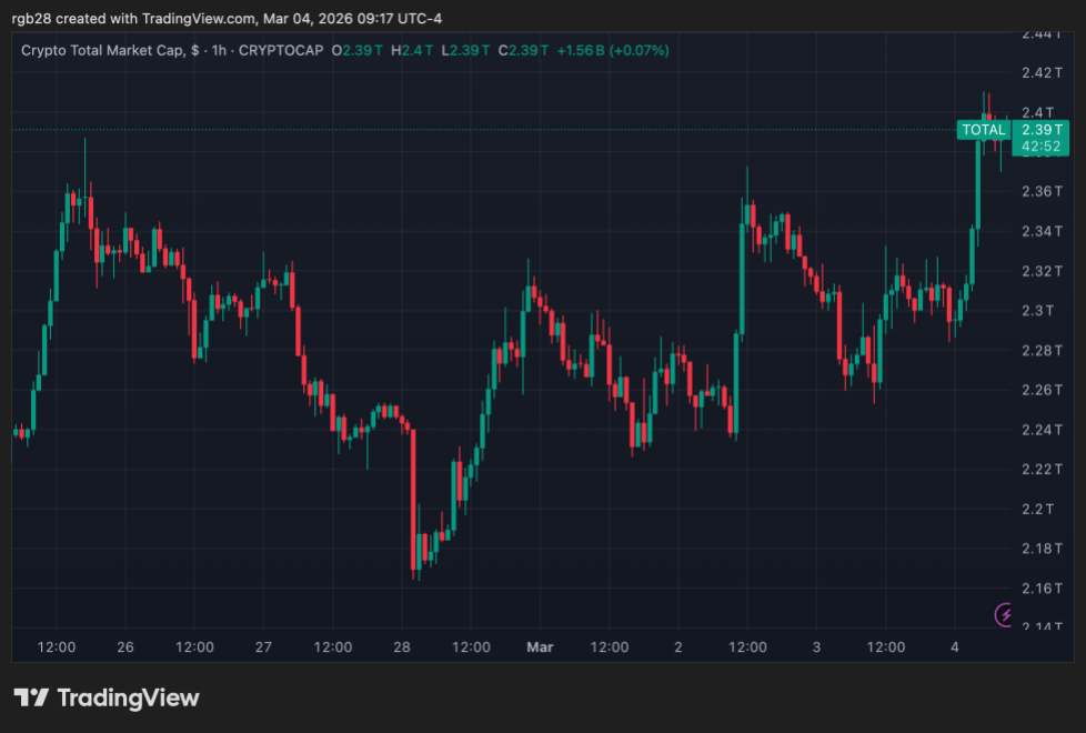 The total crypto market capitalization is at $2.39 trillion in the one-week chart. Source: TOTAL on TradingView