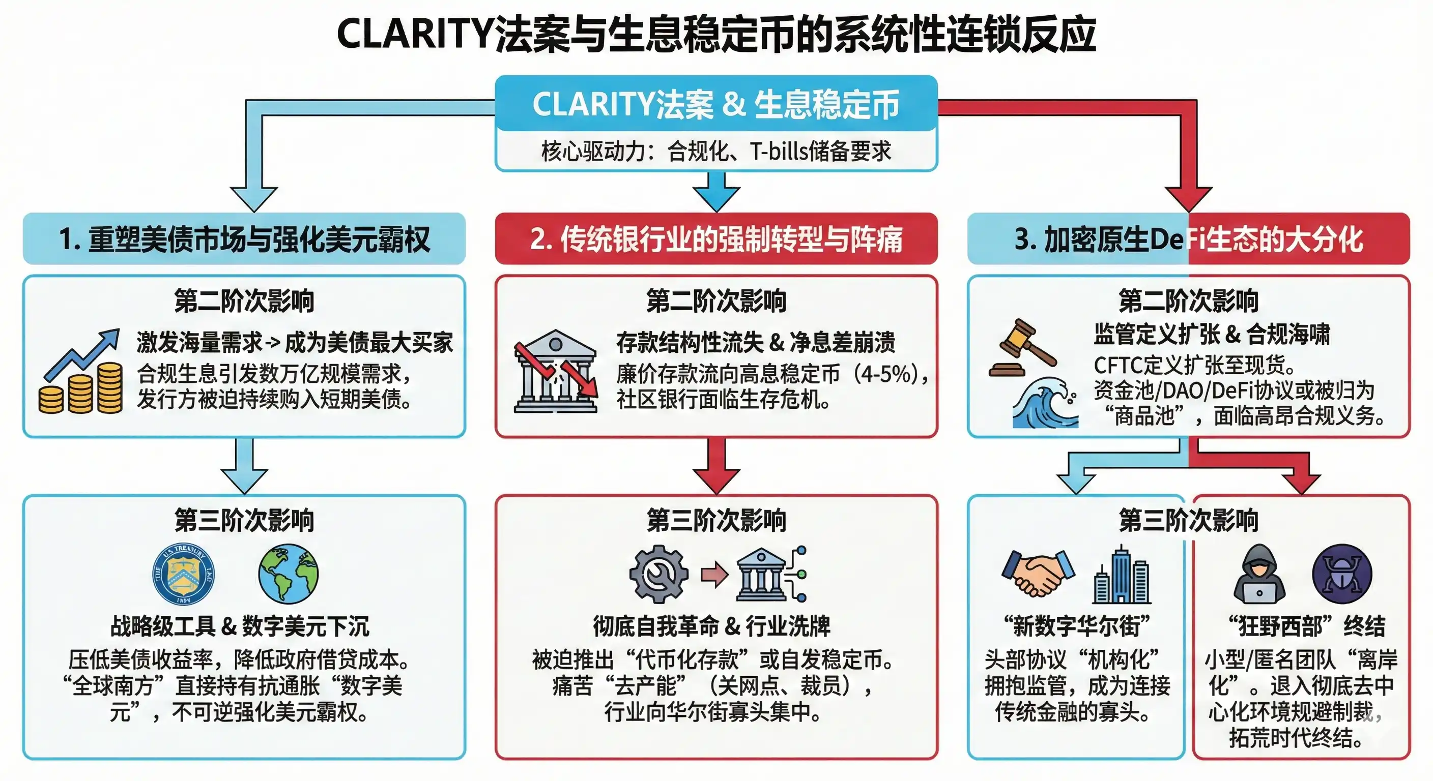 The success or failure of the CLARITY Act, and the ultimate归属 of interest-bearing stablecoin profit rights, is far from a simple redistribution of industry profits. The spillover effects of this legislation will penetrate the crypto圈层, having profound systemic ripple effects on U.S. macro debt financing, the global hegemony of the dollar, and the evolution of the traditional financial system.