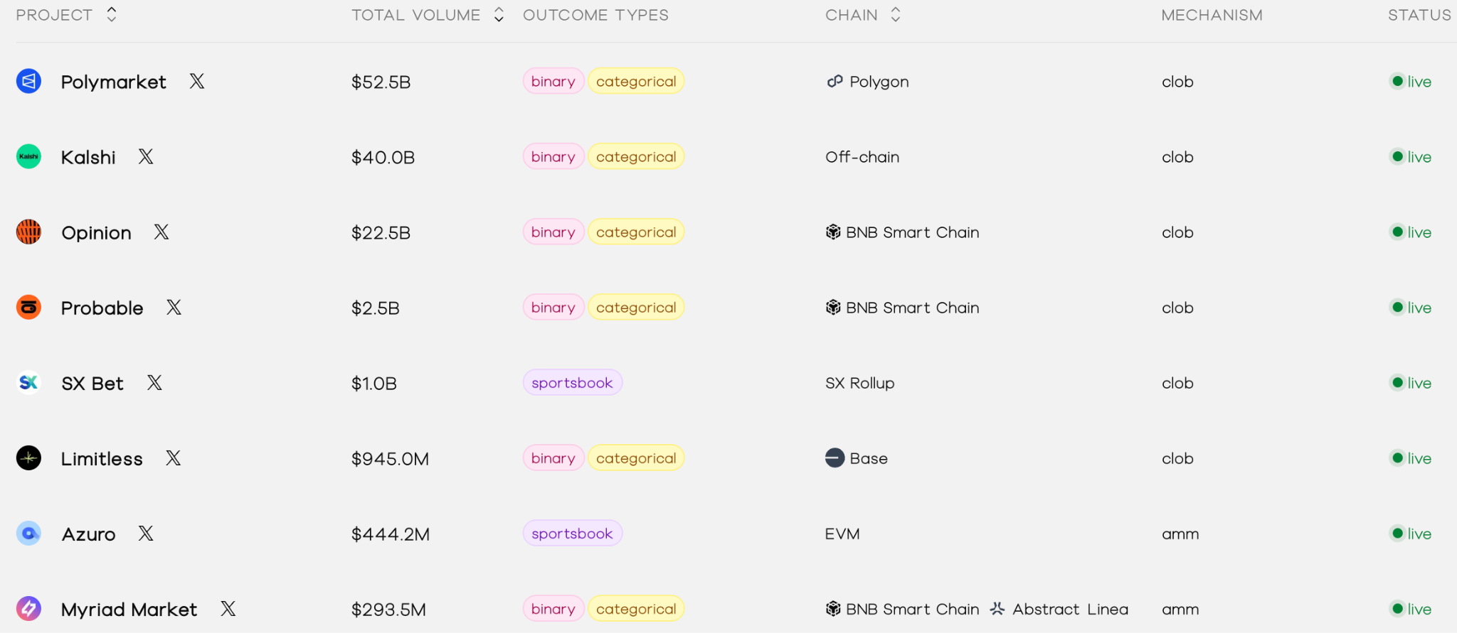 Although prediction markets cooled down significantly after the election—Polymarket's daily trading volume plummeted by about 84% after the results were announced—the number of prediction market projects grew rapidly entering 2025. Now, in 2026, data from predictionindex.xyz shows there are as many as 137 prediction market projects, with the leading player, Polymarket, having a total trading volume exceeding $50 billion and a monthly trading volume of $8 billion.