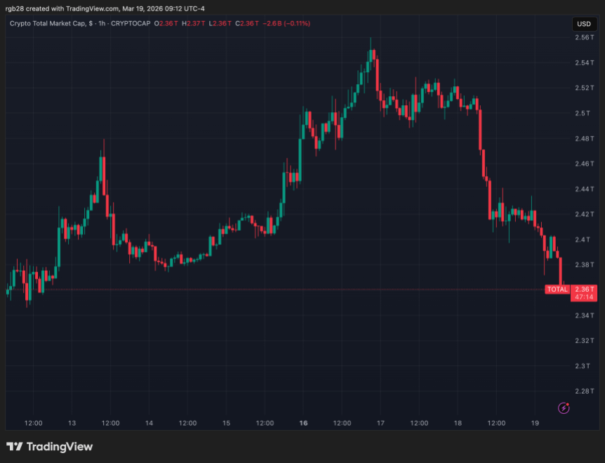 The total crypto market capitalization is at $2.36 trillion in the one-week chart. Source: TOTAL on TradingView