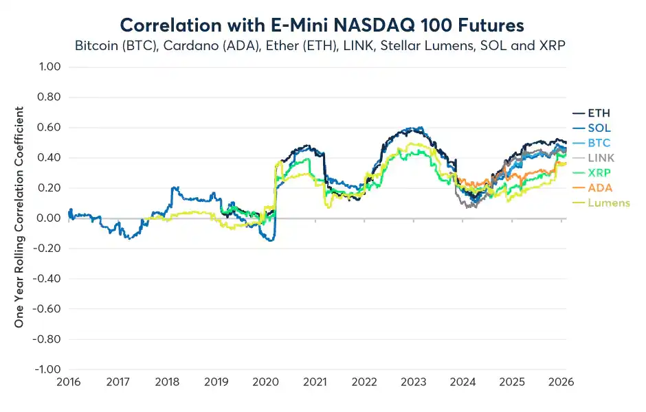 Research from CME Group points out that since 2020, the correlation between crypto assets and the Nasdaq 100 has been positive for a long time, and in some phases of early 2025 and 2026, the rolling correlation can reach approximately +0.35 to +0.6 (clearly阶段性, not constant).