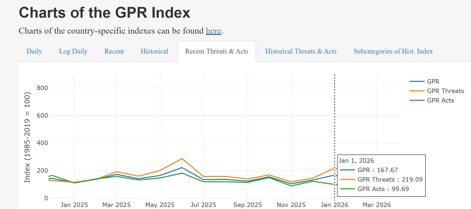 The Geopolitical Risk Index is an indicator that measures changes in global geopolitical risk, typically used to assess the potential impact of political instability, conflict, war, policy changes, and other factors on the economy and markets of countries or regions. More importantly, this system breaks down risk into two more "tradable" components: