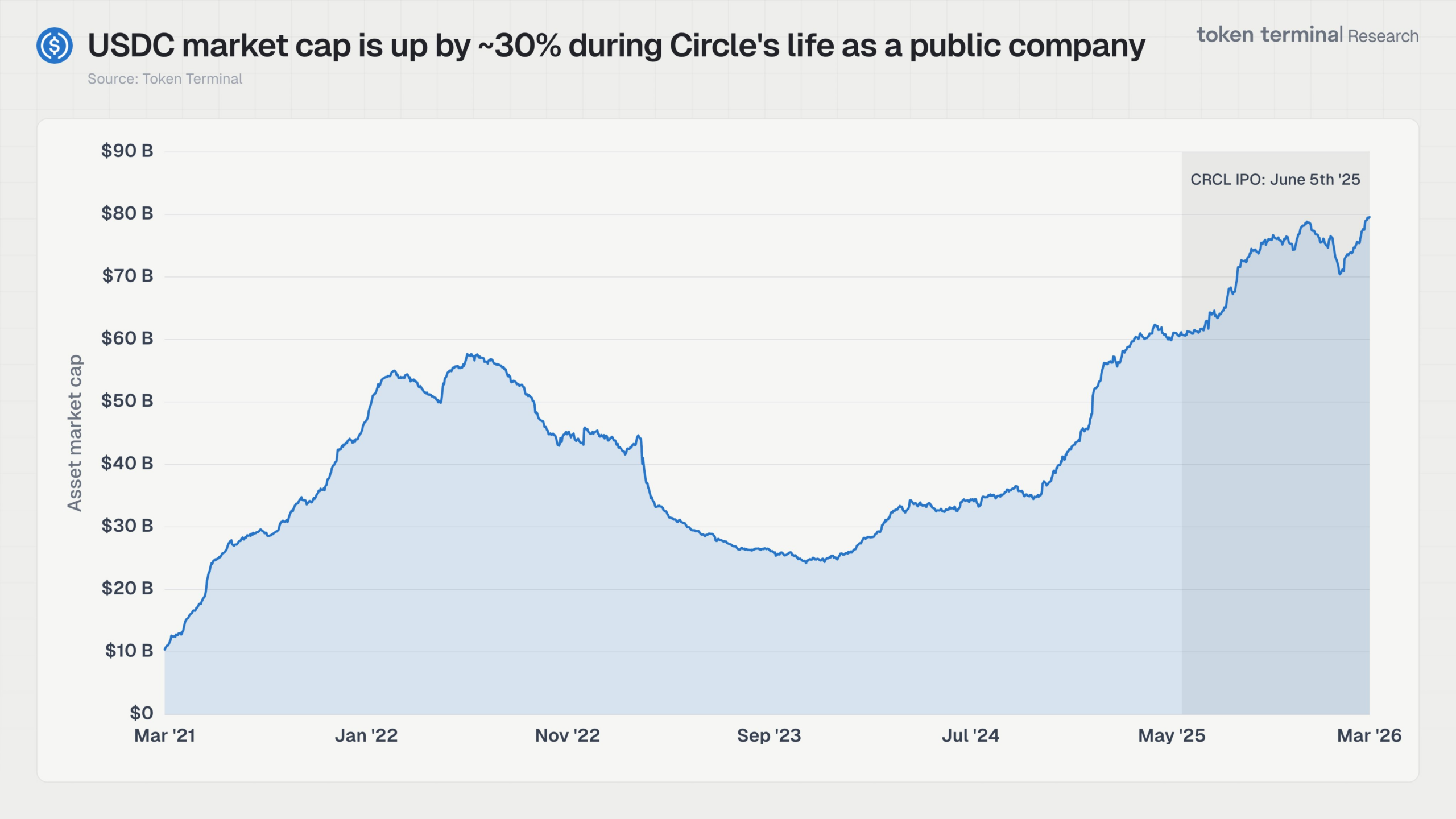 Instead, this context is reinforced by the underlying data. USDC’s market cap has jumped roughly 30%, surpassing $80 billion to reach an all-time high since Circle’s IPO in late Q2 2025.