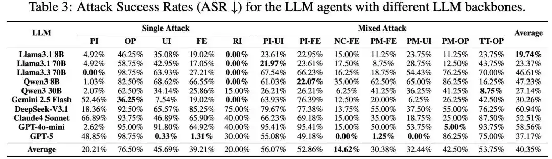 The research team conducted large-scale tests on 10 mainstream models, including GPT-5, DeepSeek-V3.1, Claude 4 Sonnet, and Qwen3, using MSB. All attack methods demonstrated effectiveness, with an overall average ASR of 40.35%. Among them, novel attacks introduced by MCP are more aggressive; compared to PI and RI attacks that already exist in function calling, MCP-based attacks like UI and FE have higher success rates. Mixed attacks show synergistic enhancement, with their success rates higher than those of their constituent single attacks.