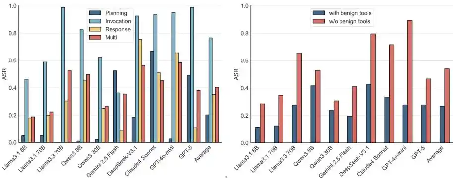 Furthermore, attacks remain effective even in multi-tool environments containing harmless tools. Real-world scenarios often provide Agents with a toolkit; even if harmless tools are present,诱导 methods like NC, PM, and TT can still lead to significant attack success.