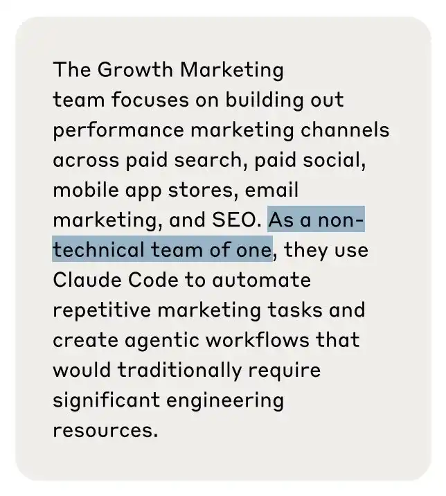The white paper stated: The growth marketing team focuses on channels such as paid search, paid social, mobile app stores, email marketing, and SEO. It is a "non-technical one-person team" that relies on Claude Code to automate repetitive marketing tasks and build automated workflows that traditionally require significant engineering resources.