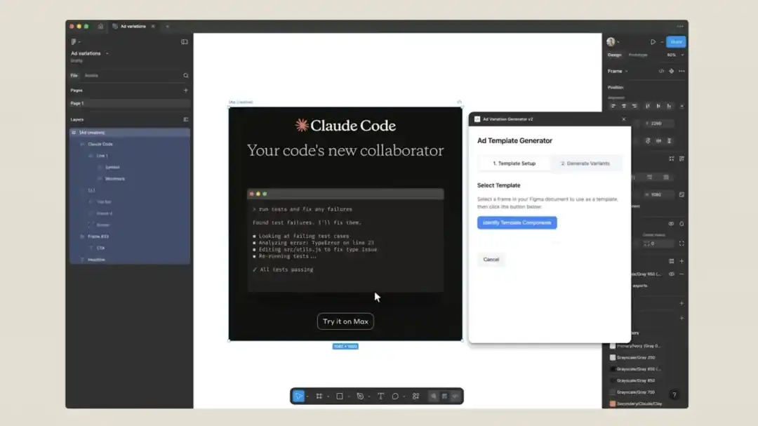 The plugin works as follows: select a static image frame, and the plugin automatically identifies components such as headlines, call-to-action buttons, and code blocks. It then batch-generates independent Figma frames from a prepared list of copy, with each variation corresponding to a new set of text. A single batch process can generate up to 100 ad variations, taking about half a second per batch. What used to take 30 minutes of manual work now takes 30 seconds.