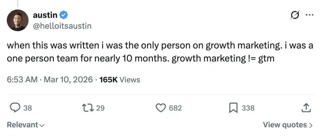 Of course, it's important to note that growth marketing is not the same as the entire GTM (go-to-market). Anthropic has full brand, product marketing, and communications teams. Austin Lau is responsible for the performance marketing line—quantifiable channels like paid advertising, app store optimization, and SEO.