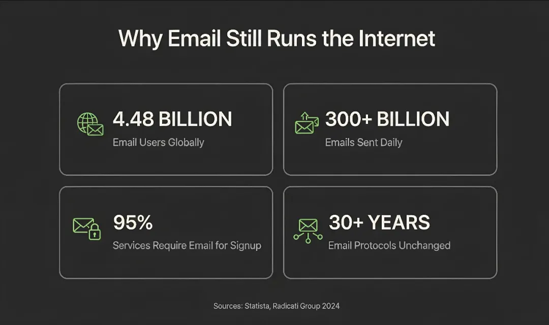 Email is so powerful because of its universality and decentralized nature. No single company controls the entire email system; protocols like SMTP and IMAP have remained largely unchanged for decades. There are 4.8 billion email accounts globally, and almost every service accepts them. This universality is unmatched by other communication methods. Social media platforms have their own account systems, instant messaging tools are scattered across different ecosystems, but email is universal. When AI agents have programmatic access to email, they gain a significant advantage.