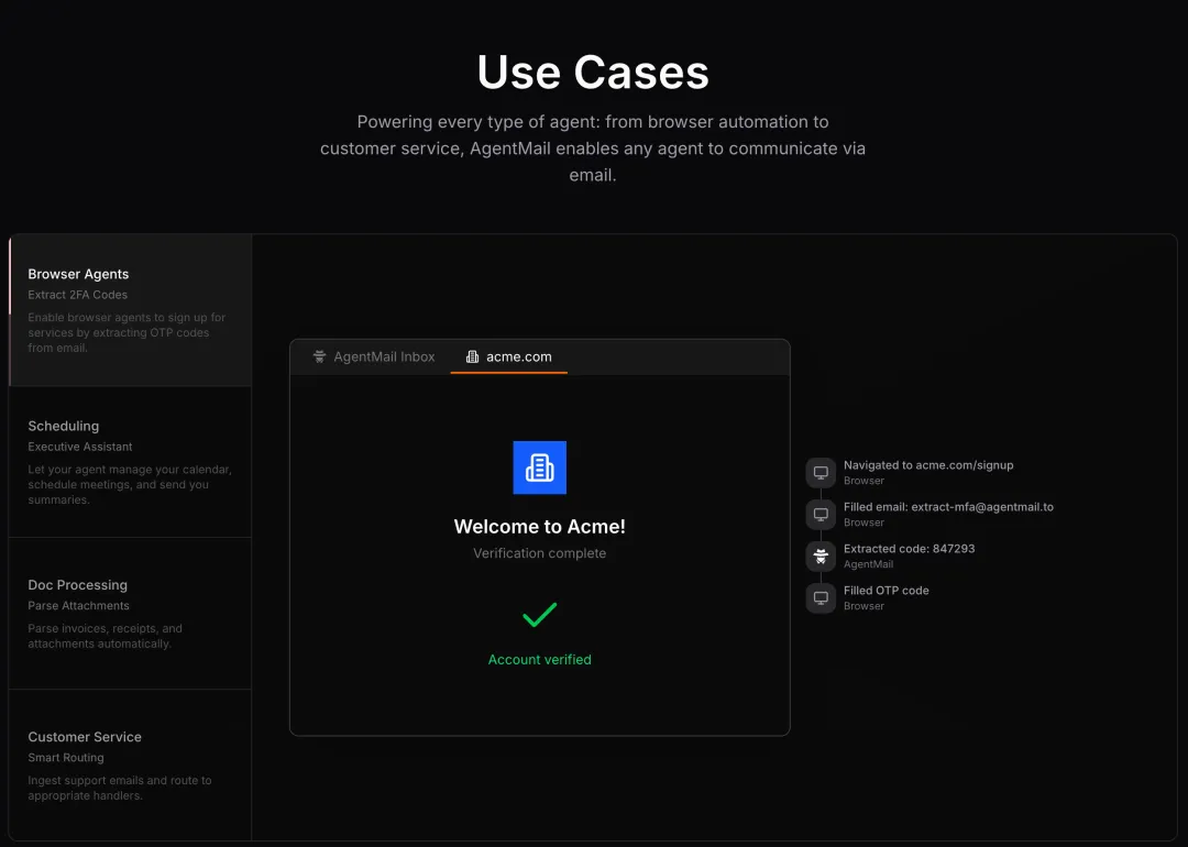 Since launching in the Y Combinator Summer 2025 batch, AgentMail has attracted tens of thousands of human users and hundreds of thousands of "AI agent users," along with over 500 B2B customers. These numbers themselves are impressive, but what interests me more is the diversity of these use cases.