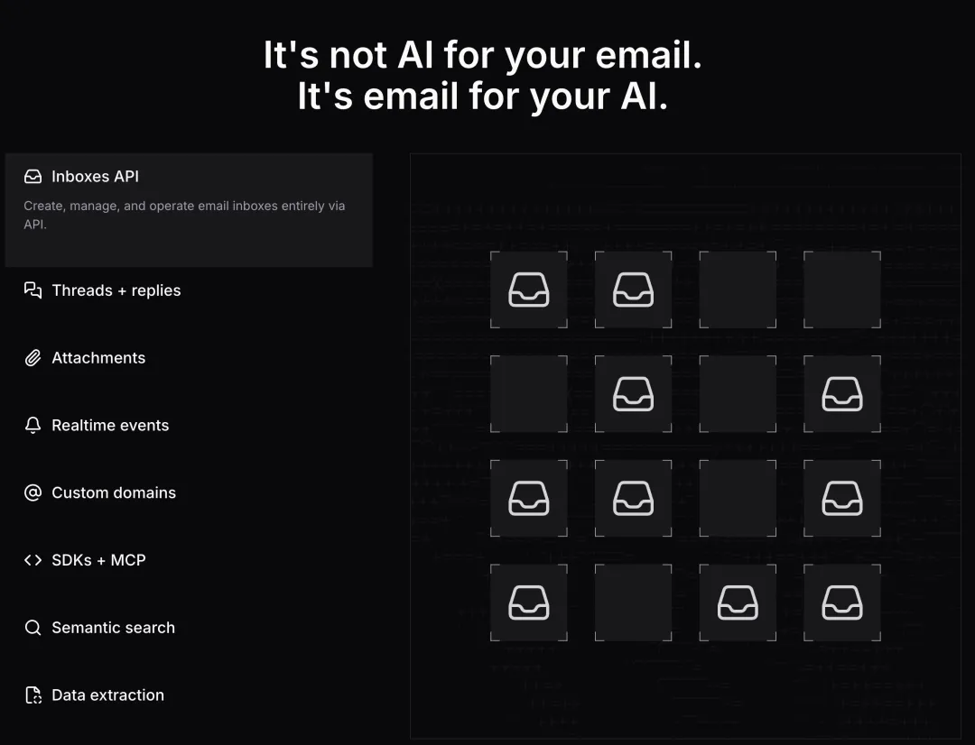Unlike transactional email APIs that can only send one-way notifications, AgentMail is built for AI agents that need to engage in real conversations. AI agents can extract structured data from unstructured emails, automatically label and categorize incoming messages. Webhooks and WebSockets deliver events in real time. It supports LangChain, LlamaIndex, CrewAI, and any framework that can make API calls out of the box.