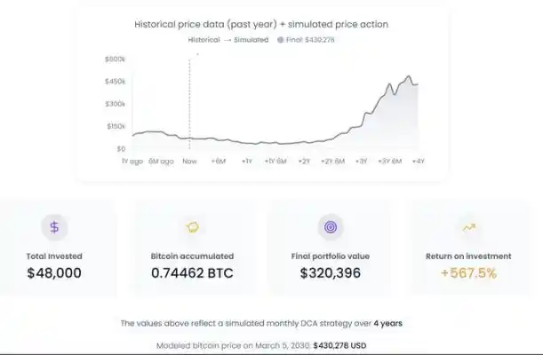 Based on this model, analysts estimate that the long-term trend support level could break through $100,000 by 2028, which also serves as the foundational assumption for future DCA modeling. Bitcoin Well's simulation shows that by March 2030, the median price projection is approximately $430,000.