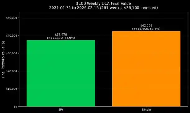In February of this year, Swan Bitcoin analyst Adam Livingston compared on platform X the returns of DCA into BTC versus the S&P 500 over the past five years. Investing $100 weekly, BTC yielded $42,508, while the S&P 500 yielded $37,470, with returns of 62.9% and 43.6% respectively.