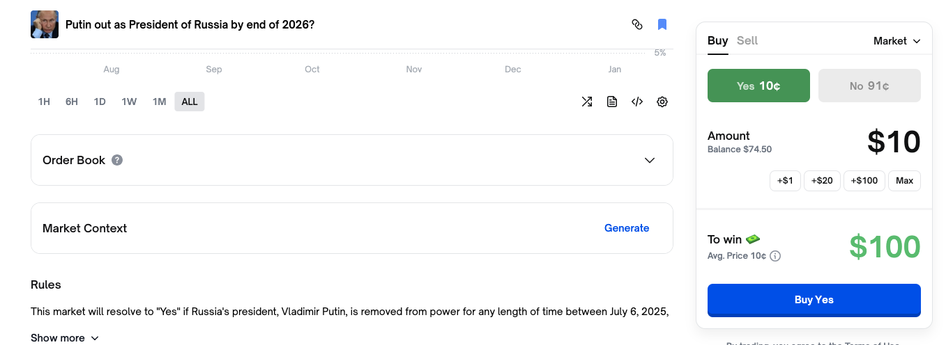 But actually, this psychology of "lottery players" is also rational. For example, in the event contract "Will Putin step down before the end of 2026?", driven by common sense, most people will buy "No," and the probability already shows people's attitude. But the Yes side still has a 10% probability, meaning if you bet $10, you could get $100 back if Putin really steps down before the end of 2026—a 10x return. So, why not gamble?