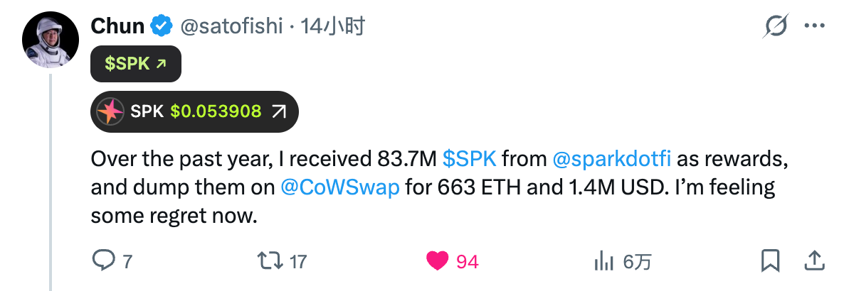 Even Wang Chun, founder of F2Pool, lamented on X: "In the past year, I received 83.7 million SPK rewards from Spark and sold them on CoWSwap for 663 ETH and $1.4 million. Now I kind of regret it."